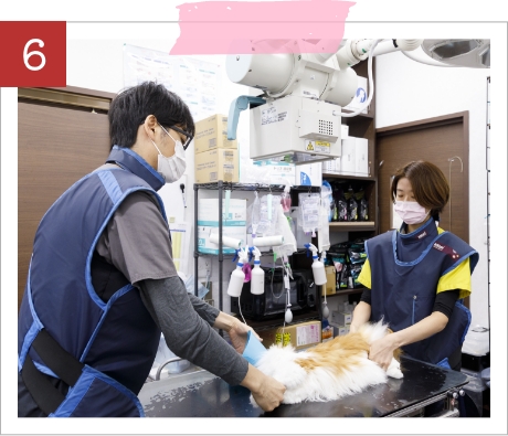 ⑤エリザベスカラーを装着して、血液を採取します。「すぐ終わるからね、がんばろうね」看護師さんが体を押さえながら、優しく声をかけて緊張をほぐします。1分程度であっという間に終了。