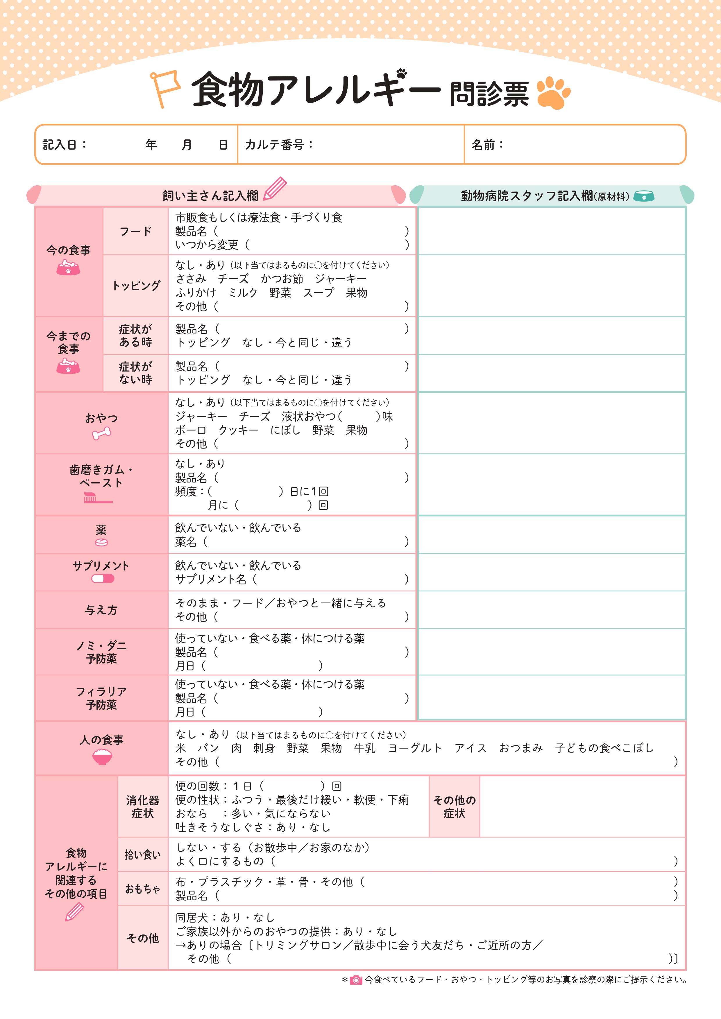 除去食試験中は決められた食事とお水以外は与えないことですね。前述したように、おやつや薬、サプリメント、野菜や果物、おもちゃなどでも症状が出る可能性があるので注意してください。ただ、除去食試験に使用している食事に使われている原材料であれば、トッピングとして使用できるので、それは獣医師に相談してください。もし除去食試験期間中にうっかり別のものをあげてしまったときは、食べてしまったものと、その後の皮膚やうんちの状態を記録しておき、再診の時に獣医師に伝えてください。