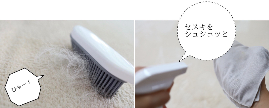 とはいえ丸洗いは大変なので、日々のケアは、「掃除機→コロコロ→ゴム製ブラシや手袋で抜け毛を絡めとる→セスキ水を雑巾にふりかけて毛足をやさしく拭く」で完了。