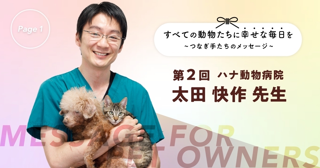 今回、お話を伺ったのは学生時代から動物保護に力を注ぎ、動物愛護の先駆者として、獣医師となった今もその活動に尽力しているハナ動物病院の太田快作先生。自身の活動について、「動物が好きだから、犬も猫も目が合えば拾うし、助けたいと思うし。当たり前のことをやってるだけなんですけどね」とはにかむ先生に、日本の動物保護活動についての考えや「すべての動物たちが幸せを掴むために、私たちにできること」についてじっくり伺いました。