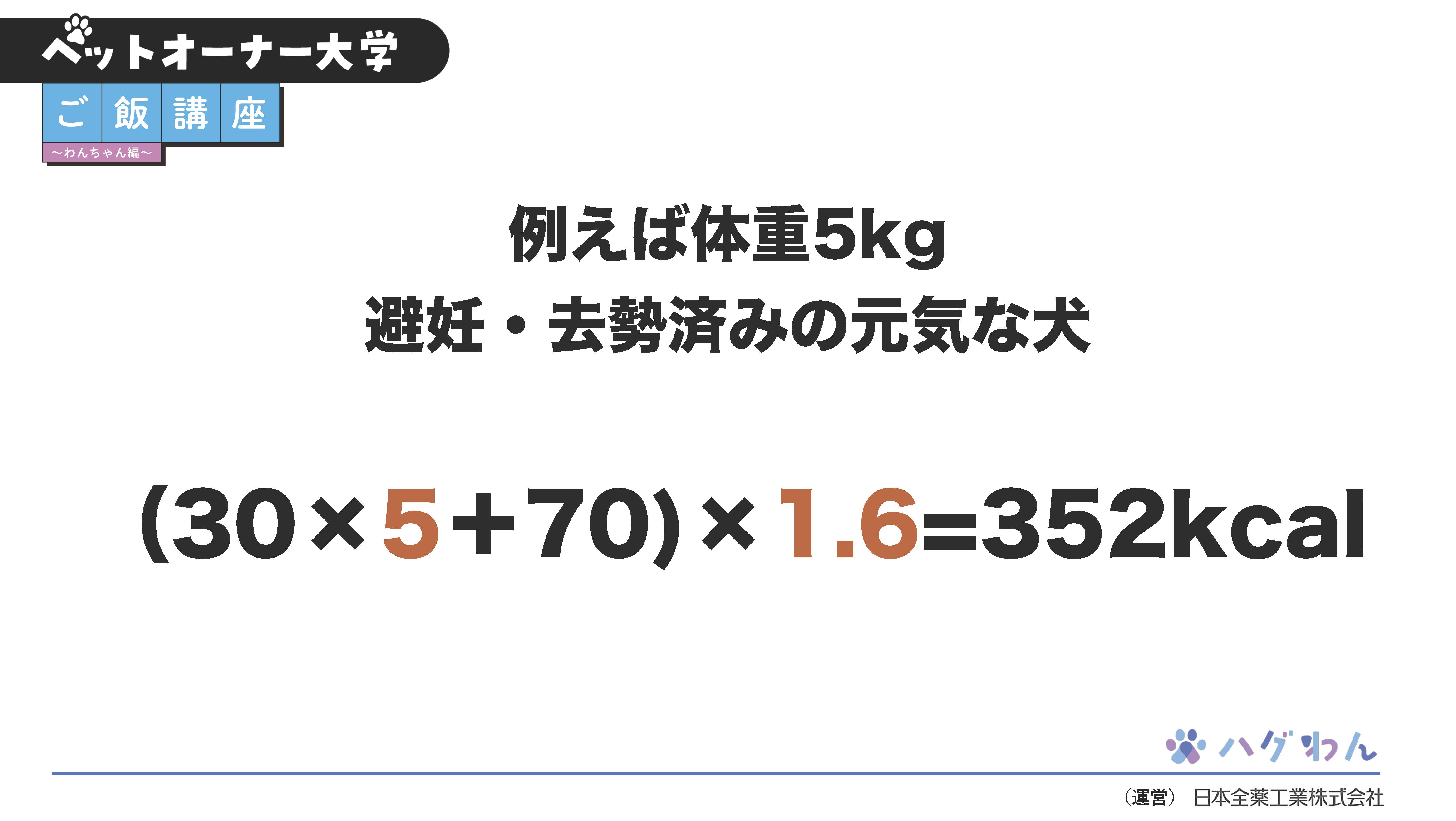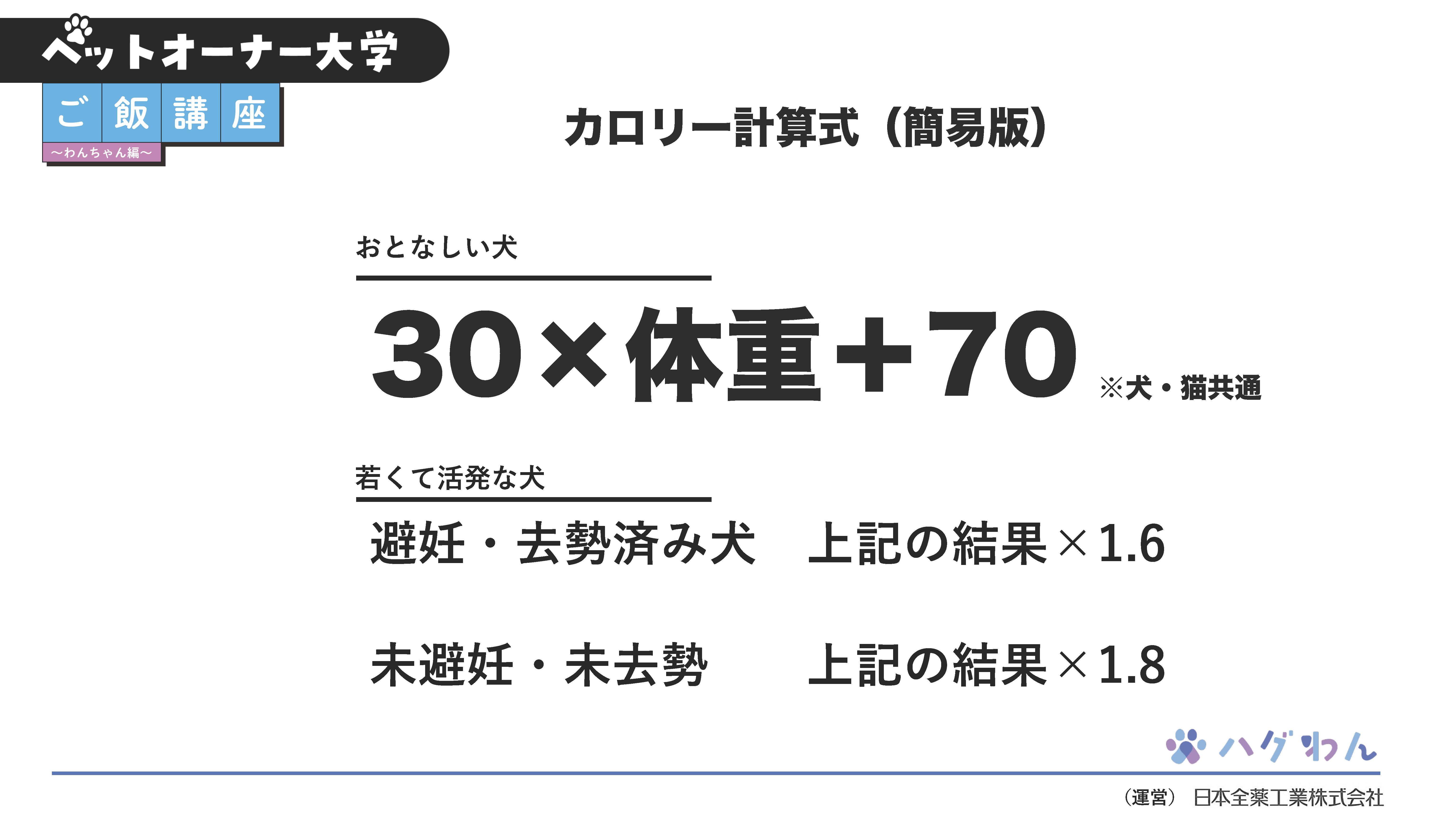 森先生避妊・去勢済み:1.6を掛けてください。未避妊・未去勢:1.8を掛けます。高齢犬(シニア)は1.4を掛けると計算できます。