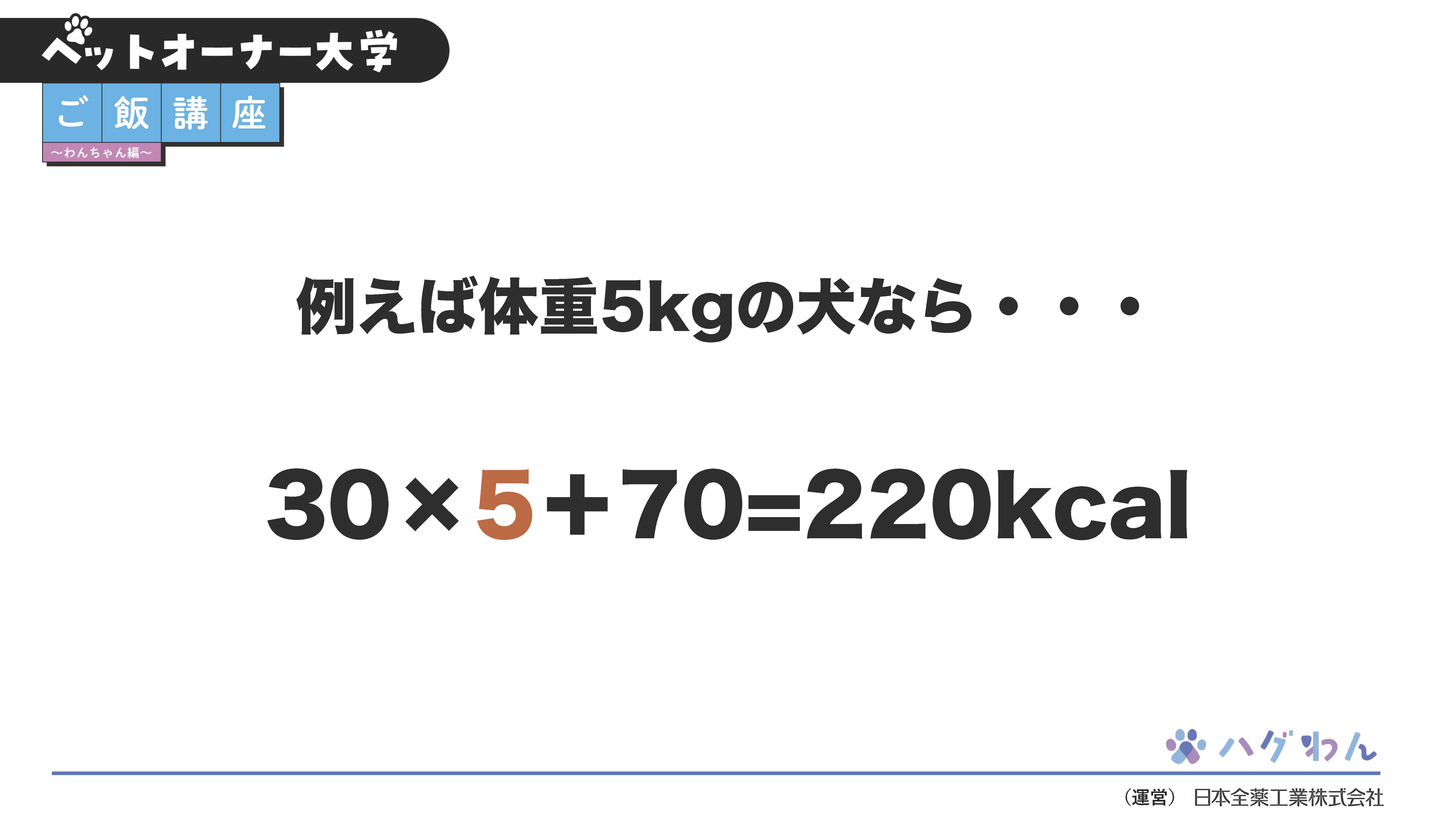 森先生わんちゃんに必要な1日のカロリーは、以下の計算式で求められます。 おとなしい犬というのはほとんどケージで動かないわんちゃんを指します。