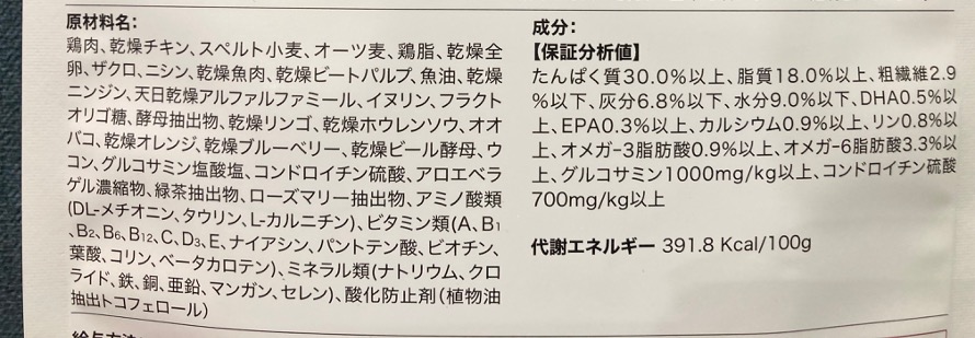 左向先生日本の基準ではタンパク質は18%以上と定められていますのでこのフードはまずそれを満たしていますね。ただ、だからといってタンパク質が多ければいいのではなく、タンパク質の成分を見る必要があります。それを知れるのが原材料の表示です。原材料は「含有量が多い順」に書かれています。一番最初に「ちゃんとしたお肉」の名前が書かれているかを確認すると良いでしょう。このフードは最初に「鶏肉」がきていますので、その点もよいフードだと思います。あとは、タンパク質の量だけでなく、カルシウムやリンとのバランスが適切に設計されていることが重要です。