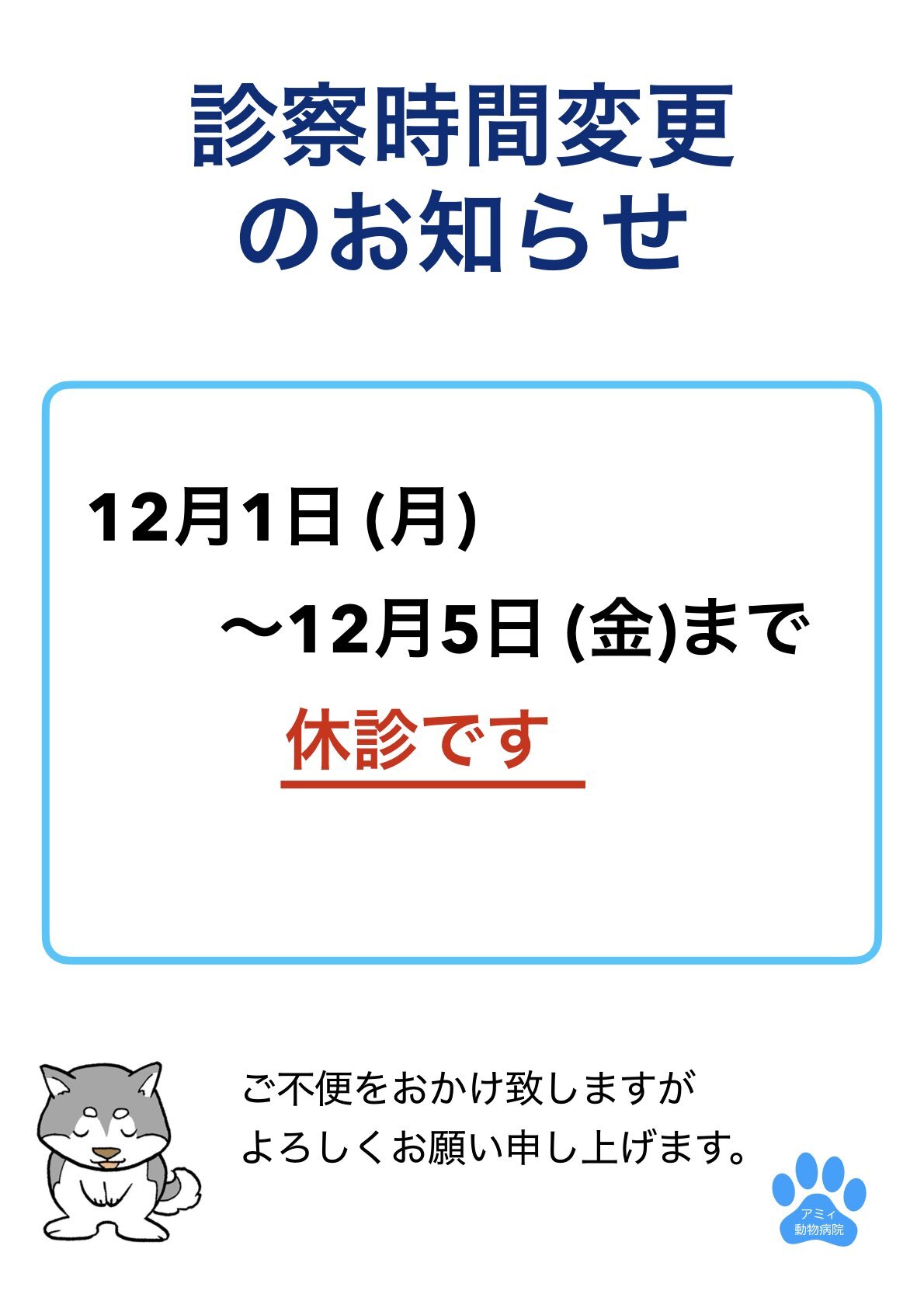 12月1日~5日まで休診のお知らせ