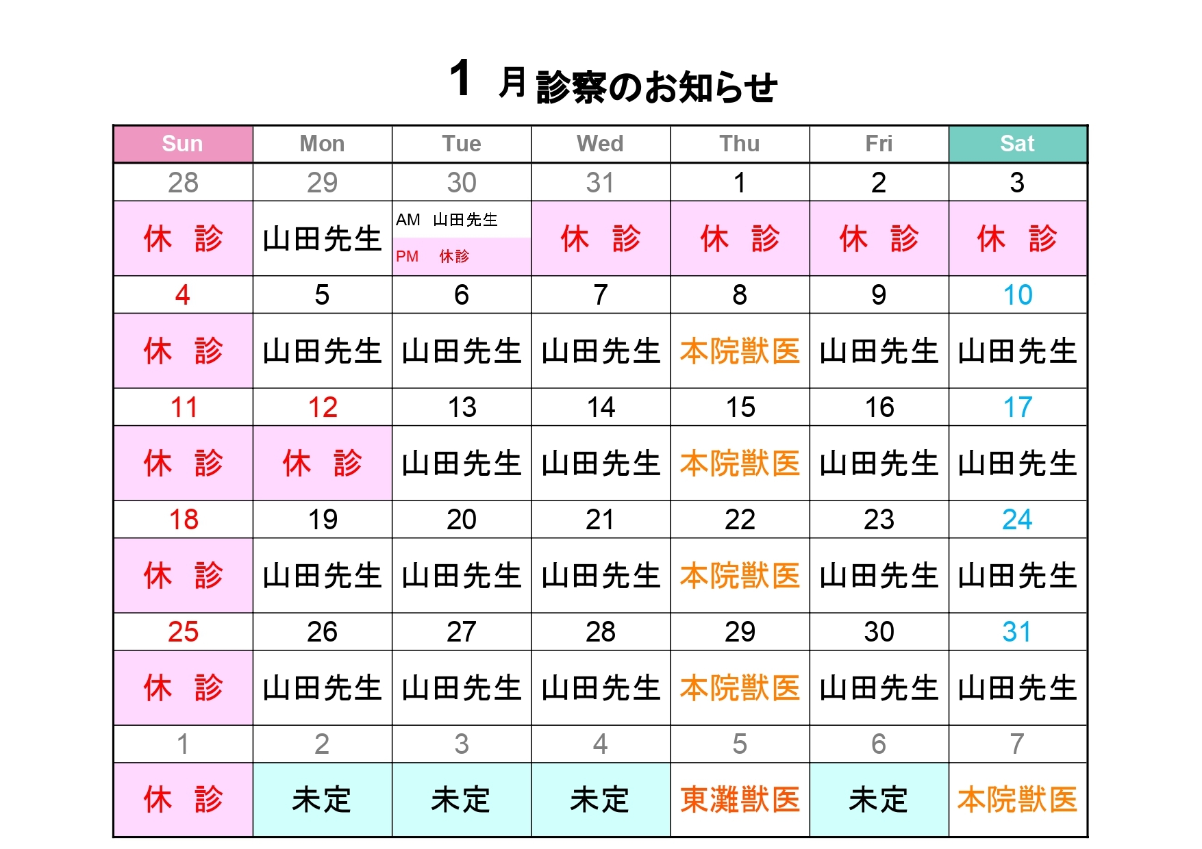 1月獣医師勤務表🎍